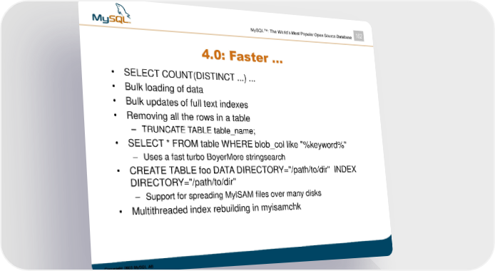 MySQL™: The World’s Most Popular Open Source Database 162 4.0: Faster ... • SELECT COUNT(DISTINCT ...) ... • Bulk loading of data • Bulk updates of full text indexes • Removing all the rows in a table – TRUNCATE TABLE table_name; • SELECT * FROM table WHERE blob_col like "%keyword%" – Uses a fast turbo BoyerMore stringsearch • CREATE TABLE foo DATA DIRECTORY="/path/to/dir" INDEX DIRECTORY="/path/to/dir" – Support for spreading MyISAM files over many disks • Multithreaded index rebuilding in myisamchk Copyright 2003 MySQL AB