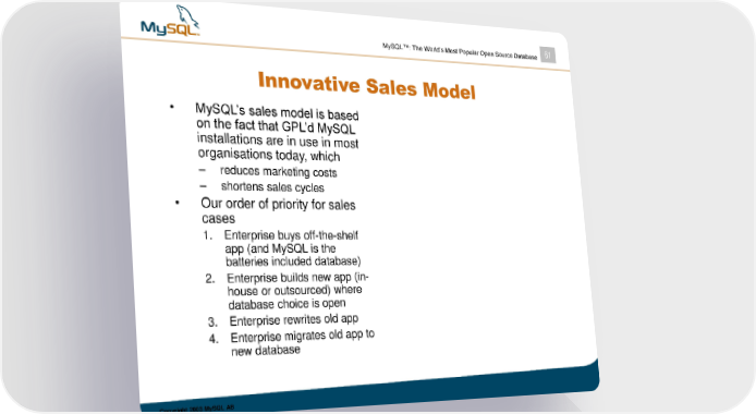 MySQL™: The World’s Most Popular Open Source Database 61 Innovative Sales Model • MySQL’s sales model is based on the fact that GPL’d MySQL installations are in use in most organisations today, which – reduces marketing costs – shortens sales cycles • Our order of priority for sales cases 1. Enterprise buys off-the-shelf app (and MySQL is the batteries included database) 2. Enterprise builds new app (in- house or outsourced) where database choice is open 3. Enterprise rewrites old app 4. Enterprise migrates old app to new database Copyright 2003 MySQL AB