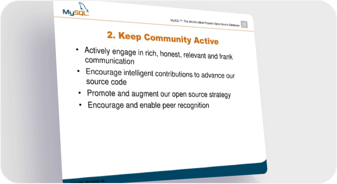 MySQL™: The World’s Most Popular Open Source Database 28 2. Keep Community Active • Actively engage in rich, honest, relevant and frank communication • Encourage intelligent contributions to advance our source code • Promote and augment our open source strategy • Encourage and enable peer recognition Copyright 2003 MySQL AB