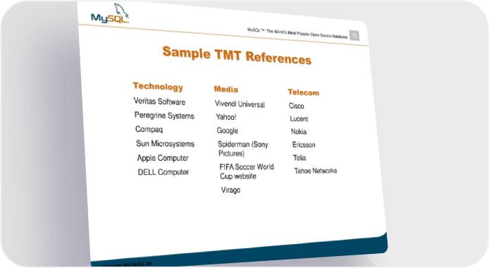 MySQL™: The World’s Most Popular Open Source Database 76 Sample TMT References Technology Media Telecom Veritas Software Vivendi Universal Cisco Peregrine Systems Yahoo! Lucent Compaq Google Nokia Sun Microsystems Spiderman (Sony Ericsson Apple Computer Pictures) Telia DELL Computer FIFA Soccer World Tahoe Networks Cup website Virage Copyright 2003 MySQL AB