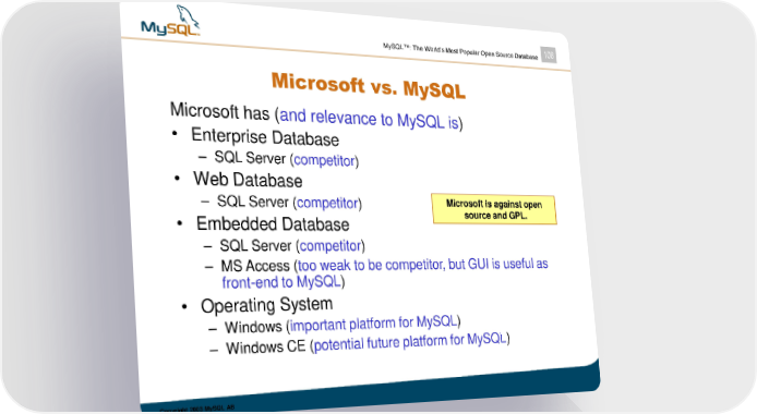 MySQL™: The World’s Most Popular Open Source Database 108 Microsoft vs. MySQL Microsoft has (and relevance to MySQL is) • Enterprise Database – SQL Server (competitor) • Web Database – SQL Server (competitor) Microsoft is against open • Embedded Database source and GPL. – SQL Server (competitor) – MS Access (too weak to be competitor, but GUI is useful as front-end to MySQL) • Operating System – Windows (important platform for MySQL) – Windows CE (potential future platform for MySQL) Copyright 2003 MySQL AB