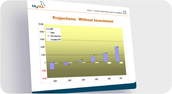 MySQL™: The World’s Most Popular Open Source Database 94 Projections: Without Investment 10 000 EBIT 8 000 Capex Free Cash Flow 6 000 Cumulative FCF 4 000 2 000 0 -2 000 -4 000 2002 2003 2004 2005 2006 2007 Copyright 2003 MySQL AB