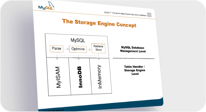 MySQL™: The World’s Most Popular Open Source Database 176 The Storage Engine Concept MySQL Parse Optimize Retrieve MySQL Database Store Management Level B Table Handler / ory Storage Engine SAMI em Level yM InnoD nM I Copyright 2003 MySQL AB
