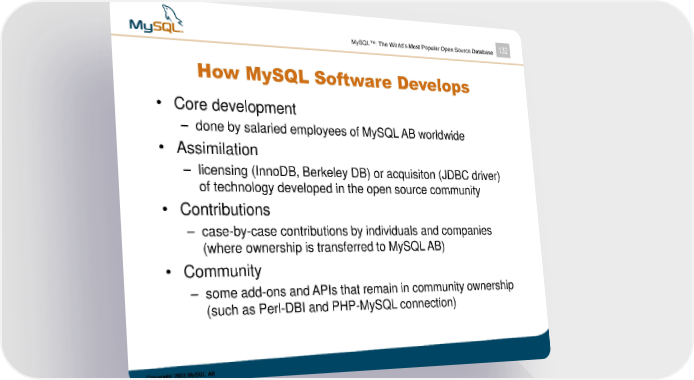 MySQL™: The World’s Most Popular Open Source Database 132 How MySQL Software Develops • Core development – done by salaried employees of MySQL AB worldwide • Assimilation – licensing (InnoDB, Berkeley DB) or acquisiton (JDBC driver) of technology developed in the open source community • Contributions – case-by-case contributions by individuals and companies (where ownership is transferred to MySQL AB) • Community – some add-ons and APIs that remain in community ownership (such as Perl-DBI and PHP-MySQL connection) Copyright 2003 MySQL AB