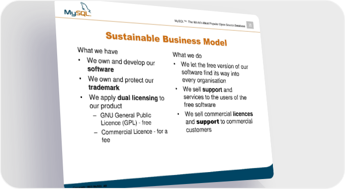 MySQL™: The World’s Most Popular Open Source Database 38 Sustainable Business Model What we have What we do • We own and develop our • We let the free version of our software software find its way into • We own and protect our every organisation trademark • We sell support and • We apply dual licensing to services to the users of the our product free software – GNU General Public • We sell commercial licences Licence (GPL) - free and supportto commercial – Commercial Licence - for a customers fee Copyright 2003 MySQL AB