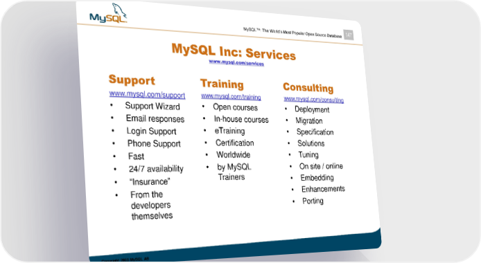 MySQL™: The World’s Most Popular Open Source Database 147 MySQL Inc: Services www.mysql.com/services Support Training Consulting www.mysql.com/support www.mysql.com/training www.mysql.com/consulting • Support Wizard • Open courses • Deployment • Email responses • In-house courses • Migration • Login Support • eTraining • Specification • Phone Support • Certification • Solutions • Fast • Worldwide • Tuning • 24/7 availability • by MySQL • On site / online Trainers • Embedding • “Insurance” • From the • Enhancements developers • Porting themselves Copyright 2003 MySQL AB