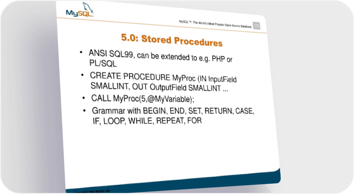 MySQL™: The World’s Most Popular Open Source Database 170 5.0: Stored Procedures • ANSI SQL99, can be extended to e.g. PHP or PL/SQL • CREATE PROCEDURE MyProc (IN InputField SMALLINT, OUT OutputField SMALLINT ... • CALL MyProc(5,@MyVariable); • Grammar with BEGIN, END, SET, RETURN, CASE, IF, LOOP, WHILE, REPEAT, FOR Copyright 2003 MySQL AB
