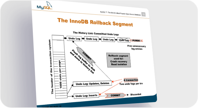 MySQL™: The World’s Most Popular Open Source Database 185 The InnoDB Rollback Segment The History List: Committed Undo Logs m Undo Log Undo Log Undo Log Undo Log PURGE tes Free unnecessary y s log entries no tic Rollback segment as e used for: na g Crash recovery tr r pa Read isolation eth pe of ts r e slo da 00 A transaction e h 10 Undo Log: Updates, Deletes Two undo logs per trx eh T Undo Log: Inserts Discarded Copyright 2003 MySQL AB