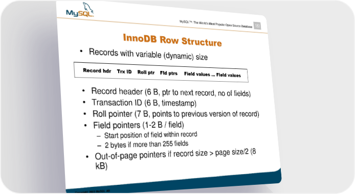 MySQL™: The World’s Most Popular Open Source Database 183 InnoDB Row Structure • Records with variable (dynamic) size Record hdr Trx ID Roll ptr Fld ptrs Field values ... Field values • Record header (6 B, ptr to next record, no of fields) • Transaction ID (6 B, timestamp) • Roll pointer (7 B, points to previous version of record) • Field pointers (1-2 B / field) – Start position of field within record – 2 bytes if more than 255 fields • Out-of-page pointers if record size > page size/2 (8 kB) Copyright 2003 MySQL AB