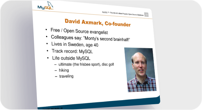 MySQL™: The World’s Most Popular Open Source Database 100 David Axmark, Co-founder • Free / Open Source evangelist • Colleagues say: ”Monty’s second brainhalf!” • Lives in Sweden, age 40 • Track record: MySQL • Life outside MySQL – ultimate (the frisbee sport), disc golf – hiking – traveling Copyright 2003 MySQL AB