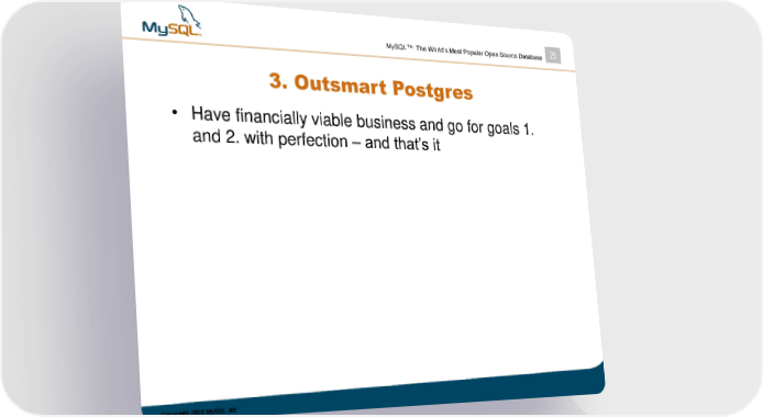 MySQL™: The World’s Most Popular Open Source Database 29 3. Outsmart Postgres • Have financially viable business and go for goals 1. and 2. with perfection – and that’s it Copyright 2003 MySQL AB MySQL Page 28 Page 30