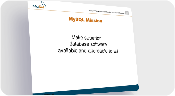 MySQL™: The World’s Most Popular Open Source Database 33 MySQL Mission Make superior database software available and affordable to all Copyright 2003 MySQL AB MySQL Page 32 Page 34