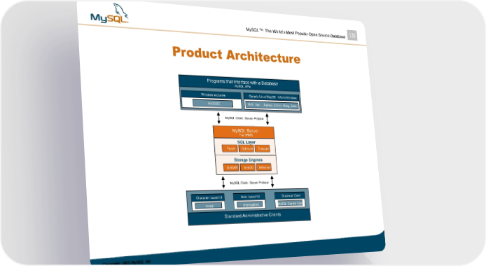 MySQL™: The World’s Most Popular Open Source Database 136 Product Architecture PPrrogogrramams ths thatat InInteterrfaface ce wwiithth a a DDatatababasease MMyySSQQLL AAPPIIss WWiinnddoowwss eexxcclluussiivvee GGeenneerriicc LLiinnuuxx// MMaaccOOSS XX//UUnniixx//WWiinnddoowwss MMyyOODDBBCC PPHHPP,, PPeerrll ,, PPyytthhoonn,, CC//CC++++,, RRuubbyy,, JJaavvaa…… MMyySSQQLL CClliieenntt-- SSeerrvveerr PPrroottooccooll MMySySQLQL S Seerrveverr TThhee DDBBMMSS SQSQLL LLayayerer PPaarrsseerr OOppttiimmiizzeerr EExxeeccuuttoorr StoStorragage e EnEnggiinneses MMyyIISSAAMM IInnnnooDDBB InHMEemAPory MMyySSQQLL CClliieenntt-- SSeerrvveerr PPrroottooccooll CChhaarraacctteerr-- bbaasseedd UUII WWeebb-- bbaasseedd UUII GGrraapphhiiccaall CClliieenntt mmyyssqqll pphhppmmyyaaddmmiinn MySQL Cmoynctcrol Centre SStatannddaarrdd AAddmmiinniistrstraatitiveve ClCliieenntsts Copyright 2003 MySQL AB