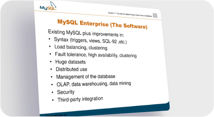 MySQL™: The World’s Most Popular Open Source Database 77 MySQL Enterprise (The Software) Existing MySQL plus improvements in: • Syntax (triggers, views, SQL-92 ,etc.) • Load balancing, clustering • Fault tolerance, high availability, clustering • Huge datasets • Distributed use • Management of the database • OLAP, data warehousing, data mining • Security • Third-party integration Copyright 2003 MySQL AB