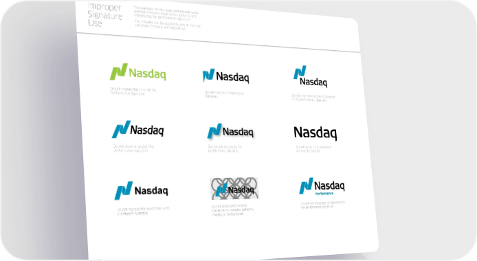 Improper The examples on this page demonstrate some common mistakes made when applying and Signature reproducing the performance signature. The mistakes can be applied to any of the logo Use variations (Primary and Secondary). Do not change the color of the Do not crop the Performance Do not alter the position of elements Performance Signature Signature of the performance signature Do not skew or stretch the Do not add effects to the Do not present the wordmark performance signature performance signature without the symbol Nasdaq Performance Do not replace the wordmark with Do not place performance Do not add messages or elements to a different typeface signature on complex patterns, the performance signature images or backgrounds 13