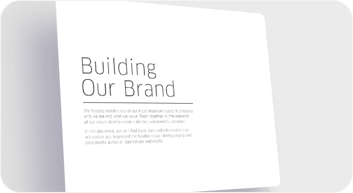 Building Our Brand The Nasdaq brand is one of our most important assets. It embodies who we are and what we value. Taken together, all the elements of our visual identity create a distinct and powerful presence. In this document, you will find basic tools and information that will enable you to present the Nasdaq visual identity clearly and consistently across all applications and media.