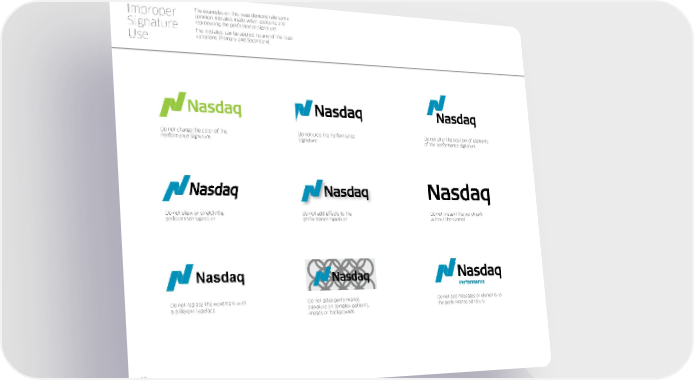 Improper The examples on this page demonstrate some common mistakes made when applying and Signature reproducing the performance signature. The mistakes can be applied to any of the logo Use variations (Primary and Secondary). Do not change the color of the Do not crop the Performance Do not alter the position of elements Performance Signature Signature of the performance signature Do not skew or stretch the Do not add effects to the Do not present the wordmark performance signature performance signature without the symbol Nasdaq Performance Do not replace the wordmark with Do not place performance Do not add messages or elements to a different typeface signature on complex patterns, the performance signature images or backgrounds 13