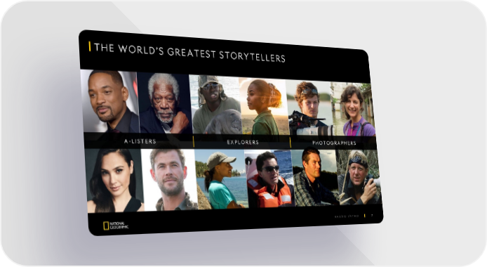 National Geographic Brand Intro Page 6 Page 8THE WORLD’S GREATEST STORYTELLERS A-LISTERS EXPLORERS PHOTOGRAPHERS BRAND INTRO 7