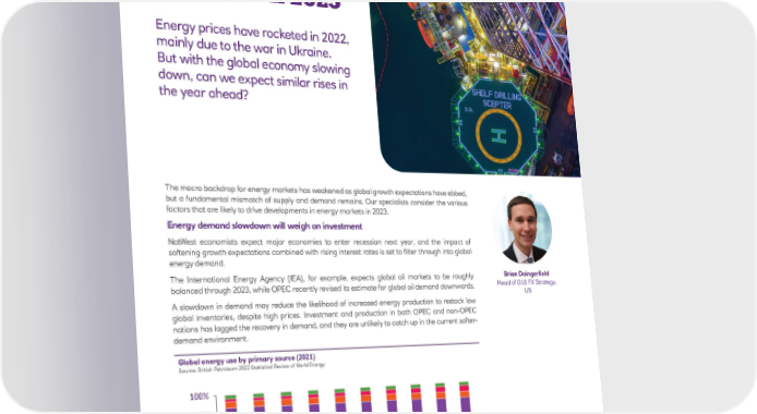 Running on empty: what’s in store for energy markets in 2023 Energy prices have rocketed in 2022, mainly due to the war in Ukraine. But with the global economy slowing down, can we expect similar rises in the year ahead? The macro backdrop for energy markets has weakened as global growth expectations have ebbed, but a fundamental mismatch of supply and demand remains. Our specialists consider the various factors that are likely to drive developments in energy markets in 2023. Energy demand slowdown will weigh on investment NatWest economists expect major economies to enter recession next year, and the impact of softening growth expectations combined with rising interest rates is set to filter through into global energy demand. The International Energy Agency (IEA), for example, expects global oil markets to be roughly Brian Daingerfield balanced through 2023, while OPEC recently revised its estimate for global oil demand downwards. Head of G10 FX Strategy, US A slowdown in demand may reduce the likelihood of increased energy production to restock low global inventories, despite high prices. Investment and production in both OPEC and non-OPEC nations has lagged the recovery in demand, and they are unlikely to catch up in the current softer- demand environment. Global energy use by primary source (2021) Source: British Petroleum 2022 Statistical Review of World Energy 100% 80% 60% 40% 20% 0% 2012 2013 2014 2015 2016 2017 2018 2019 2020 2021 Oil Coal Natural Gas Hydro Electric Renewables Nuclear Energy For any terms used, please refer to this glossary The Year Ahead 2023 | 6