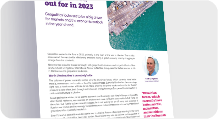 Fuelling the fire: the biggest geopolitical risks to look out for in 2023 Geopolitics looks set to be a big driver for markets and the economic outlook in the year ahead. Geopolitics came to the fore in 2022, primarily in the form of the war in Ukraine. The conflict accentuated the supply-side inflationary pressures facing a global economy already struggling to emerge from the pandemic. Next year too looks like it could be fraught with geopolitical turbulence, and not just in Ukraine. Here is where Scott Livingstone, International Advisor to NatWest Group, sees the likeliest sources of risk in 2023 across the geopolitical landscape. War in Ukraine: time is on nobody’s side The balance of power currently resides with the Ukrainian forces, which currently have better Scott Livingstone morale, momentum, and munitions than the Russian troops. But while Ukraine has the advantage International Advisor right now, a harsh winter will take its toll. We’re entering the prime weeks and months for Russian pressure to take effect, both through restrictions on energy flowing to Europe and the destruction of civilian infrastructure in Ukraine. As we get into the winter, as we see the economic and the energy cost rising in Europe and possibly “Ukrainian after the US midterms, we could see an environment more conducive to some kind of off ramp for forces, which the crisis. But Putin’s actions recently suggest he is not looking for an off-ramp, and evidence of currently have Russian war crimes and increasingly focused attacks on civilian infrastructure do not lay the political better morale, groundwork for a peaceful resolution. momentum, Even if there’s a peaceful resolution to the war in Ukraine, Russian oil and gas returning to the world and munitions market would come with a heavy tax burden. Reparations may also be an issue as the question of who pays to rebuild Ukraine is yet to be answered. There will be conversations in Washington and than the Russian European capitals about bringing Russian energy back to the market as part of a package that troops.” deals with that question. In the medium term, we cannot rule out a collapse in Russia’s capability and forces in Ukraine as its forces struggle with logistics and command and control. My view is that there is no doubt whatsoever that whatever happens in Ukraine, Russia will emerge in a weaker position. And into that vacuum other players, notably China, could step up their regional influence, particularly in Central Asia. For any terms used, please refer to this glossary The Year Ahead 2023 | 15