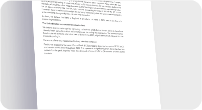 What are the implications for central banks and monetary policy? While central banks could be forgiven for having not foreseen the extent of the energy price shock in 2022, the experience and the criticism they have encountered suggest policymakers will be wary about easing monetary policy soon. To date, there has been no substantial progress in bringing down either inflation or wages. Until measures of inflation clearly reverse, we think it will be difficult for central banks not to continue to raise interest rates. Although we forecast substantial declines in inflation in 2023, we still expect headline CPI rates to exceed 2% in the US, eurozone and UK at the end of next year. That doesn’t preclude interest rate cuts later on in the year, but our base case is still that rate cuts will not materialise until 2024. The United Kingdom: sterling’s weakness a thorn in the Bank of England’s side The Bank of England ramped up its hawkish rhetoric in the aftermath of the UK government’s recent tax-cutting Growth Plan, warning of a ‘significant’ monetary policy response. Policymakers did step up the pace of tightening in November, hiking by 75 basis points to 3.0%, but also cast doubt on the market’s pricing of terminal rates of around 5.25%. Sterling’s weakness remains a potential problem for an open economy like the UK, with imports accounting for around 30% of the CPI basket. However, there have been some signs the currency is stabilising since the government’s fiscal policy U-turn and the changes of prime minister and chancellor. In short, we believe the Bank of England is unlikely to cut rates in 2023, even in the face of a deepening recession. The United States: more room for rates to climb We believe that monetary policy tightening cycles have a little further to run, although there have already been some hints that policymakers are becoming less aggressive. We forecast the Fed Funds rate will climb to a terminal rate of 5.0% in mid-2023, slightly below the 5.1% peak that the market is pricing in. Eurozone: of the trio, most inclined to keep rate rises contained Finally, we expect the European Central Bank (ECB) to raise its depo rate to a peak of 2.25% by Q1 and remain at this level throughout 2023. This represents a significantly more dovish (and earlier) outlook for the peak in policy rates than the peak of around 3.0% in Q4 currently priced in by the markets. For any terms used, please refer to this glossary The Year Ahead 2023 | 14