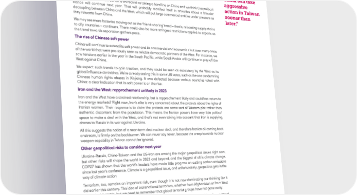Taiwan: risk of military action? Tensions are rising between the US and China once again, but don’t expect them to escalate into the military realm in 2023. From the US side, it’s more likely that we’ll see a continuation of the trend of the last six months since Nancy Pelosi visited Taiwan, fuelled partly by anti-China sentiment. And while there’s a view in China that the West’s influence (cultural, geopolitical, and economic) is waning, China has seen what’s happened in Ukraine – that invading a country is very costly and difficult, and that success cannot be guaranteed. That said, there’s a real risk that China will take aggressive action in Taiwan sooner than later. If China “There’s a were to use its military capability in Taiwan, it would probably be in the form of a comprehensive real risk that blockade of the island. China will take Trade war 2.0 and friend-shoring aggressive UK Prime Minister Rishi Sunak is on record as taking a hard line on China and we think that political action in Taiwan stance will continue next year. That will probably manifest itself in anxieties about a broader sooner than decoupling between China and the West, which will put large commercial entities under pressure as later.” they relocate from China. We may see more factories moving out as the ‘friend-shoring’ trend – that is, relocating supply chains to ally countries – continues. There could also be more stringent restrictions applied to exports as the trend towards separation gathers pace. The rise of Chinese soft power China will continue to extend its soft power and its commercial and economic clout over many areas of the world that were previously seen as reliable democratic partners of the West. For instance, we saw tensions earlier in the year in the South Pacific, while Saudi Arabia will continue to play off the West against China. We expect such trends to gain traction, and they could be seen as escalatory by the West as its global influence diminishes. We’re already seeing this in some UN votes, such as the one condemning Chinese human rights abuses in Xinjiang. It was defeated because various countries voted with China: a clear indication that its soft power is on the rise. Iran and the West: rapprochement unlikely in 2023 Iran and the West have a strained relationship, but is rapprochement likely and could Iran return to the energy markets? Right now, Iran’s elite is very concerned about the protests about the rights of Iranian women. Their response is to claim the protests are some sort of Western plot rather than authentic discontent from the population. This means the Iranian powers have very little political space to make a deal with the West, and that’s not even taking into account that Iran is supplying drones to Russia in its war against Ukraine. All this suggests the notion of a near-term deal nuclear deal, and therefore Iranian oil coming back onstream, is firmly on the backburner. We can never say never, because the creep towards nuclear weapon capability in Tehran cannot be ignored. Other geopolitical risks to consider next year Ukraine-Russia, China-Taiwan and the US-Iran are among the major geopolitical issues right now, but other risks will shape the world in 2023 and beyond, and the biggest of all is climate change. COP27 has shown that the world’s leaders have made little progress on cutting carbon emissions since last year’s conference. Climate is a geopolitical issue, and unfortunately, geopolitics gets in the way of climate action Terrorism, too, remains an important risk, even though it is not now dominating our thinking like it did earlier this century. The idea of transnational terrorism, whether from Afghanistan or from West Africa, is debatable, but we need to remember that global terrorist groups have not gone away. Pakistan is having a very difficult time, dealing with the combined impacts of flooding, political and economic failure, and an unheard-of challenge between civilian and military leaders that is generating a sense of looming instability. This is not helpful in the context of Pakistan’s ongoing rivalry with India, and we must remember these two countries are nuclear powers. Then there is North Korea. We saw provocative missile-firing from the country recently, and most observers are anticipating a first nuclear test in a number of years. The main danger we see here is the unpredictability of the North Korean regime. After the US midterms, meanwhile, we’re waiting to see the direction of US foreign policy and the state of US governance. In all, 2023 promises to be an eventful year from a geopolitical perspective. For any terms used, please refer to this glossary The Year Ahead 2023 | 16