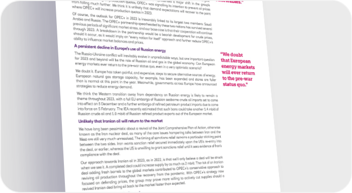 Opportunities to switch energy sources One source of demand for oil, regardless of the macro environment, is the drive amongst consumers, manufacturers, and power producers to switch sources. We expect switching activity to remain generally supportive of oil prices as oil remains attractive relative to natural gas in terms of cost. “Another Another potential beneficiary of high natural gas prices are renewables. Recent price movements potential and climate-related investments, such as those set out in 2022’s Inflation Reduction Act in the US, beneficiary of look likely to result in increased use of renewables in electricity generation. high natural OPEC+ will likely stay the course on production cuts gas prices are After months of steady increases in oil production quotas, in October OPEC+ announced that it renewables.” would reduce oil production quotas by 2 million barrels per day (mb/d). This was much its largest production cut since the depths of the pandemic and represented a major shift in the group’s strategy. By slashing oil production quotas, OPEC+ was signalling its intention to prevent oil prices from falling much further. We think it is unlikely that demand expectations will recover to the point where OPEC+ will increase production quotas in 2023. Of course, the outlook for OPEC+ in 2023 is inexorably linked to its largest two members: Saudi Arabia and Russia. The OPEC+ partnership spearheaded by these two nations has survived several previous periods of significant market stress, and our base case is that their cooperation will continue through 2023. A breakdown in the partnership would be a bearish development for crude prices, should it occur, as it would imply an “every nation for itself” approach and further reduce OPEC+’s ability to influence market balances and prices. A persistent decline in Europe’s use of Russian energy “We doubt The Russia-Ukraine conflict will inevitably evolve in unpredictable ways, but one important question that European for 2023 and beyond will be the role of Russian oil and gas in the global economy. Can European energy markets energy markets ever return to the pre-war status quo, even in a very optimistic scenario? will ever return We doubt it. Europe has taken painful, and expensive, steps to secure alternative sources of energy. to the pre-war European natural gas storage capacity, for example, has been expanded and stores are fuller than is normal at this point in the year. Meanwhile, governments across Europe have announced status quo.” strategies to reduce energy demand. We think the Western transition away from dependency on Russian energy is likely to remain a theme throughout 2023, with a full EU embargo of Russian seaborne crude oil imports set to come into effect on 5 December and a further embargo of refined petroleum product imports due to come into force on 5 February. The IEA recently estimated that such bans could take another 1.4 mb/d of Russian crude oil and 1.0 mb/d of Russian refined product exports out of the European market. Unlikely that Iranian oil will return to the market We have long been pessimistic about a revival of the Joint Comprehensive Plan of Action, otherwise known as the Iran nuclear deal, as many of the core issues hampering talks between Iran and the West are still very much unresolved. The timing of sanctions relief remains a particular sticking point between the two sides. Iran wants sanction relief secured immediately upon the US’s re-entry into the deal, or earlier, whereas the US is unwilling to grant sanctions relief until it sees evidence of Iran’s compliance with the deal. Our approach towards Iranian oil in 2023, as in 2022, is that we’ll only believe a deal will be struck when we see it. A completed deal could increase supply by as much as 2 mb/d. The risk of an Iranian deal adding fresh barrels to the global markets contributed to OPEC+’s conservative approach to reviving oil production throughout the recovery from the pandemic. With OPEC+’s strategy now focused on defending prices, the group may prove more willing to actively cut supplies should a revived Iranian deal bring oil back to the market faster than expected. A mixed outlook for US oil supply In 2022, non-OPEC producers faced a trade-off between production and investment. The recovery in near-term demand and surge in prices created a strong incentive to produce and capitalise on stronger economic conditions. But long-term challenges for the fossil fuel industry remained a headwind for investment and production. ESG considerations and the global energy transition to cleaner alternatives also represent major question marks overhanging the long-term future of fossil fuel production. In 2023, these factors may no longer act strictly in conflict. Instead, they may increasingly work in concert as an expected slowdown in demand is likely to influence future investment decisions and production growth. For any terms used, please refer to this glossary The Year Ahead 2023 | 7