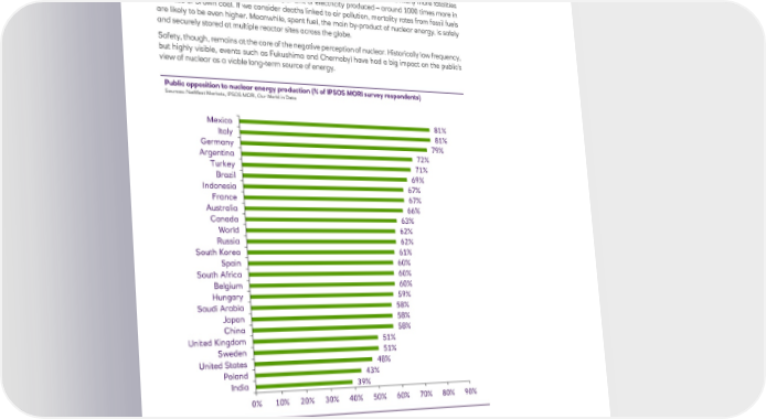 However, as of 2021, nuclear energy accounted for just 4% of global energy production – well behind oil, which accounted for close to a third of the total, natural gas, and coal. In fact, there are only a few countries where nuclear makes up a significant share of the energy mix. North America uses less nuclear power than Europe, while the share of solar and wind has gradually increased over the years and surpassed that of nuclear in 2017. Given their cost advantage, renewables will continue to play a critical role in the energy transition. But why does nuclear represent such a marginal source of global production? We think the main problems it faces are public concerns about its safety, high costs, a lack of political will and, ultimately, not enough investment. Nuclear and renewables are far safer than fossil fuels Nuclear energy has a much better safety record than fossil fuels, which cause many more fatalities than nuclear and modern renewables per unit of electricity produced – around 1000 times more in the case of brown coal. If we consider deaths linked to air pollution, mortality rates from fossil fuels are likely to be even higher. Meanwhile, spent fuel, the main by-product of nuclear energy, is safely and securely stored at multiple reactor sites across the globe. Safety, though, remains at the core of the negative perception of nuclear. Historically low frequency, but highly visible, events such as Fukushima and Chernobyl have had a big impact on the public’s view of nuclear as a viable long-term source of energy. Public opposition to nuclear energy production (% of IPSOS MORI survey respondents) Sources: NatWest Markets, IPSOS MORI, Our World in Data Mexico 81% Italy 81% Germany 79% Argentina 72% Turkey 71% Brazil 69% Indonesia 67% France 67% Australia 66% Canada 63% World 62% Russia 62% South Korea 61% Spain 60% South Africa 60% Belgium 60% Hungary 59% Saudi Arabia 58% Japan 58% China 58% United Kingdom 51% Sweden 51% United States 48% Poland 43% India 39% 0% 10% 20% 30% 40% 50% 60% 70% 80% 90% Efforts to harness nuclear’s potential are starting to increase The recent global energy crunch has reignited the debate about the role of nuclear as a reliable source of power that produces limited carbon emissions; and it has led to a number of countries making concrete plans to increase their use: • In the UK, the Energy Security Strategy published in April set out new ambitions for nuclear energy. The strategy would see nuclear capacity of up to 24 GW by 2050, representing around 25% of projected electricity demand, up from 15% in 2022. Eight reactors would be built with the help of a new government body, Great British Nuclear, to speed up what has traditionally been a slow process. For any terms used, please refer to this glossary The Year Ahead 2023 | 10