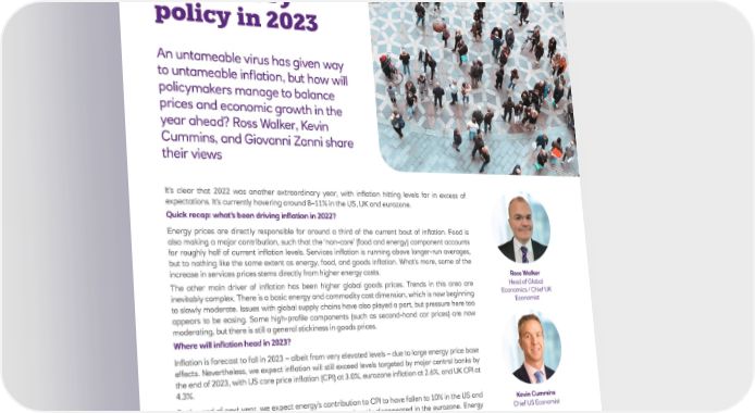 Moving beyond gas-fired inflation: prices & monetary policy in 2023 An untameable virus has given way to untameable inflation, but how will policymakers manage to balance prices and economic growth in the year ahead? Ross Walker, Kevin Cummins, and Giovanni Zanni share their views It’s clear that 2022 was another extraordinary year, with inflation hitting levels far in excess of expectations. It’s currently hovering around 8–11% in the US, UK and eurozone. Quick recap: what’s been driving inflation in 2022? Energy prices are directly responsible for around a third of the current bout of inflation. Food is also making a major contribution, such that the ‘non-core’ (food and energy) component accounts for roughly half of current inflation levels. Services inflation is running above longer-run averages, but to nothing like the same extent as energy, food, and goods inflation. What’s more, some of the increase in services prices stems directly from higher energy costs. Ross Walker The other main driver of inflation has been higher global goods prices. Trends in this area are Head of Global inevitably complex. There is a basic energy and commodity cost dimension, which is now beginning Economics / Chief UK to slowly moderate. Issues with global supply chains have also played a part, but pressure here too Economist appears to be easing. Some high-profile components (such as second-hand car prices) are now moderating, but there is still a general stickiness in goods prices. Where will inflation head in 2023? Inflation is forecast to fall in 2023 – albeit from very elevated levels – due to large energy price base effects. Nevertheless, we expect inflation will still exceed levels targeted by major central banks by the end of 2023, with US core price inflation (CPI) at 3.0%, eurozone inflation at 2.6%, and UK CPI at 4.3%. By the end of next year, we expect energy’s contribution to CPI to have fallen to 10% in the US and Kevin Cummins UK (from 20% and a third, respectively), and to have largely disappeared in the eurozone. Energy Chief US Economist prices falling from a high base will be a necessary – but probably not sufficient – condition for inflation to return to close to target levels. For year-on-year inflation not to decline in 2023 would require an extraordinary price shock. While energy prices could well rise further over the coming years, it’s hard to believe price gains in 2023 will exceed those from this year. So, inflation should fall – but how far, and how quickly? Giovanni Zanni Chief Euro Area Economist For any terms used, please refer to this glossary The Year Ahead 2023 | 12