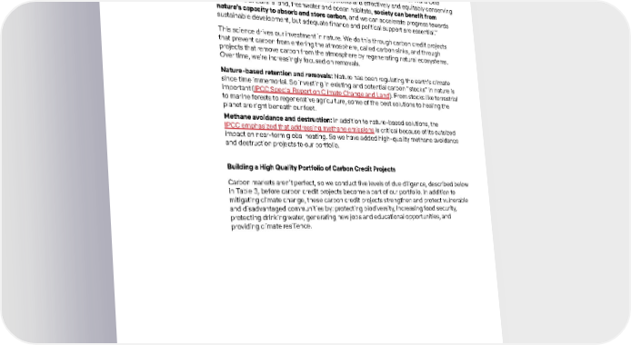 18 Environmental Our Carbon Credit Portfolio As the latest IPCC science shows, emissions cuts today are more valuable than in 5 or 10 years. Even if society is able to draw down emissions after surpassing 1.5°C (“overshoot”), certain impacts then become irreversible. As IPCC working group co-chair Hans Otto Pörtner said , “By restoring degraded ecosystems and effectively and equitably conserving 30 to 50% of Earth’s land, freshwater and ocean habitats, society can benefit from nature’s capacity to absorb and store carbon , and we can accelerate progress towards sustainable development, but adequate finance and political support are essential.” This science drives our investment in nature. We do this through carbon credit projects that prevent carbon from entering the atmosphere, called carbon sinks, and through projects that remove carbon from the atmosphere by regenerating natural ecosystems. Over time, we’re increasingly focused on removals. Nature-based retention and removals: Nature has been regulating the earth’s climate since time immemorial. So investing in existing and potential carbon “stocks” in nature is important ( IPCC Special Report on Climate Change and Land ). From stocks like terrestrial to marine forests to regenerative agriculture, some of the best solutions to healing the planet are right beneath our feet. Methane avoidance and destruction: In addition to nature-based solutions, the IPCC emphasized that addressing methane emissions is critical because of its outsized impact on near-term global heating. So we have added high-quality methane avoidance and destruction projects to our portfolio. Building a High Quality Portfolio of Carbon Credit Projects Carbon markets aren’t perfect, so we conduct five levels of due diligence, described below in Table 3, before carbon credit projects become a part of our portfolio. In addition to mitigating climate change, these carbon credit projects strengthen and protect vulnerable and disadvantaged communities by: protecting biodiversity, increasing food security, protecting drinking water, generating new jobs and educational opportunities, and providing climate resilience.