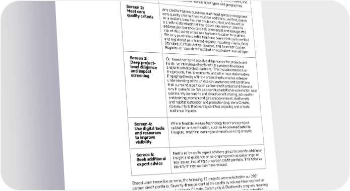 19 Environmental Table 3: Carbon Credit Project Screening Criteria Screen 1: Competitive selection Screen 4: Use digital tools and resources to improve visibility Screen 5: Seek additional expert advice Screen 3: Deep project- level diligence and impact screening Screen 2: Meet core quality criteria Our competitive requests for proposals (RFPs) are issued widely, to over 75 project developers, non-profits, brokers, and credit retailers across many project types and geographies. Our team then conducts due diligence on the projects and holds live interviews directly with the project developers and/or trusted project partners. This includes research on the projects, their proponents, and other local stakeholders. Engaging directly with the project hosts enables a deeper understanding of the unique circumstances and conditions that surround a particular carbon credit project and how and why it came to be. We also conduct additional screens for: local community ownership and direct benefit sharing; job creation and training; women and girls empowerment; biodiversity and habitat restoration and protection (e.g. Verra Climate, Community & Biodiversity certified projects); and climate resilience impacts. Where feasible, we use technology to enhance project validation and verification, such as AI-powered satellite imagery, machine learning and remote sensing analysis. Netflix relies on its expert advisory group to provide additional insight and guidance on an ongoing basis across a range of key issues, including our carbon credit portfolio. This helps us identify things we may have missed. Any credits that we purchase must meet globally recognized core quality criteria: they must be additional, verified, based on a realistic baseline, not double counted, and issued by a credible standard that has robust provisions in place to address permanence (the risk of reversal) and leakage (the risk of displacing emissions from one location to another). We only purchase credits that have been third-party verified and registered on a trusted registry, including – Verra, Gold Standard, Climate Action Reserve, and American Carbon Registry-or have demonstrated an equivalent level of rigor. Based upon these five screens, the following 17 projects were selected for our 2021 carbon credit portfolio. Seventy-three percent of the credits by volume have received an additional certification under Verra’s Climate, Community & Biodiversity program, meaning they are exemplars of maximizing benefits in addition to climate, like habitat restoration, biodiversity protection and sustainable livelihoods. We have highlighted three projects below that showcase the impacts and benefits that these projects can deliver.