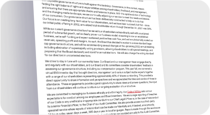 41 Governance We operate in a dynamic industry and have been in a state of constant innovation since inception. We have redefined how people watch video—first through DVD-by-mail, then streaming video, and now as one of the world’s leading entertainment services with approximately 222 million members in 190 countries. Our success has not gone unnoticed, and we are seeing increasing competition, even as this dynamic market continues to evolve. Our corporate governance structure is built against this backdrop. Governance, in this context, means finding the right balance of rights and responsibilities among shareholders, the Board, and management, and ensuring that there are appropriate checks and balances in place. With the rapid evolution of technology and the changing media landscape, we are continually adjusting our service to meet the needs and desires of our consumers. Our governance structure has been deliberately constructed to help us to do that. Our focus is on creating long-term value for our shareholders, and we have been successful at that – since our initial public offering in 2002, annualized total stockholder return through December 31, 2021 was 38%. While our current governance structure has served our shareholders extraordinarily well with a sustained period of substantial growth, we’ve clearly proven our business model: streaming is now an established business, we’re self-funding and expect sustained positive free cash flow, and we’ve substantially scaled our revenues, operating profit and margins. As such, the Board has decided to evolve to a more standard large- cap governance structure, and will be recommending several changes at the upcoming 2022 annual meeting including elimination of supermajority voting provisions, allowing shareholders to call special meetings, and proposing that the Board declassify and stand for annual elections. We will also change the voting standard for our directors in uncontested elections. We strive to stay in tune with our ownership base. Our Board and our management team engage directly and regularly with our shareholders, and our Board and its committees consider shareholders’ feedback in assessing our governance structure, including our compensation program. This past fall, we convened a virtual ESG investor day that brought directors, management and various subject matter experts together with a range of our shareholders representing approximately 40% of shares outstanding. This provided a direct opportunity to share information and perspectives and we appreciated the time and candor of those in attendance. These engagements provide a good opportunity to share views and answer questions; the input from our shareholders will continue to inform our ongoing evaluation of our structure. We are committed to managing our business ethically and with integrity. Our Code of Ethics sets out our expectations for conduct among our employees and Board members. We encourage reporting of breaches of our Code or any unethical or inappropriate conduct to our Chief Legal Officer or, in the case of misconduct by a senior financial officer, to the Chair of our Audit Committee. We also provide access to a third-party operated service where reports of misconduct can be made confidentially and, if desired, anonymously, 24 hours a day, seven days a week, 365 days a year in local languages. Reports made through this service are elevated and investigated until they are resolved, and updates are provided annually to the Audit Committee.