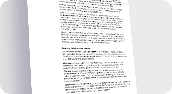 Environmental 13 Reducing Emissions from Electricity Use First, we optimize by focusing on energy efficiency , reducing the amount of electricity that we use in both our production work and also in our offices. In 2021, we conducted energy efficiency audits at select facilities to identify opportunities for energy savings through equipment upgrades and better building management practices. This analysis covered over 30% of our global square footage across stages, studios, and offices and identified cost-saving energy efficiency opportunities across our facilities. Next, we electrify the equipment that uses the most liquid fuels, like vehicles, buildings and generators. For instance, where we can, we use electric motors because they’re more efficient and electricity is more easily decarbonized. Then, for emissions sources where optimization and electrification aren’t possible, we decarbonize what’s left by installing and purchasing renewable energy. This means matching renewable electricity to any grid-connected power that isn’t carbon-free and shifting to lower-carbon or zero-carbon fuel options when connecting to the grid isn’t possible. We look for renewable energy options in the following order of preference: 1) onsite solar+storage, 2) utility provided green tariff programs, 3) direct investment or purchase agreements for offsite wind or solar, 4) unbundled Renewable Energy Certificates. We don’t own the majority of our office and stage space – we lease them. So we’re not often able to procure renewable electricity directly. In some countries, direct renewable electricity purchasing is not available, so we purchase renewable attribute certificates in those countries. And we explore ways to bring new renewable electricity generation to regions we operate in by investing in new projects and products. Reducing Emissions from Fuel Use Fuel consumption makes up a large proportion of our Scope 1 emissions, and due to the nature of our business and operations, presents unique challenges to decarbonize. We follow our internal reduction framework above of “Optimize, Electrify and Decarbonize” to tackle these hard-to-abate emissions. Optimize fuel consumption : For corporate offices, this focuses mostly on efficient creation and capture of building heat, and on the production side, can range from optimizing the size of diesel generators or reducing how long vehicles idle. Electrify vehicles, buildings, and generators : Incorporating electric vehicles into production fleets and installing EV charging infrastructure at studios are critical to reducing emissions. Up to 70% of the fuel used by productions goes into vehicles, therefore electrifying a significant portion of the production fleet will be essential over the coming decade. Decarbonize through fuel switching : We recognize that not everything can be solved with efficiency or electrification. For these use cases, Netflix is piloting ways to transition away from heavy emitting fossil fuels towards low and zero emissions fuels like renewable diesel, sustainable aviation fuel (SAF), and green hydrogen.