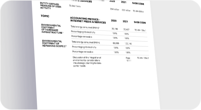 2021 marked a year of significant progress for Netflix in terms of addressing our emissions and incorporating sustainability into our core business practices. ENTITY-DEFINED MEASURE OF USER ACTIVITY Subscribers 204 million 222 million TC-IM-000.A 26,196 100% 100% 68,089 100% 100% 33,407 100% 100% 123,148 100% 100% TC-IM-130a.1 TC-IM-130a.3 ENVIRONMENTAL FOOTPRINT OF HARDWARE INFRASTRUCTURE 1 ENVIRONMENTAL FOOTPRINT OF REMAINING SCOPE 2 3 Total energy consumed (MWh) 2 Percentage grid electricity Percentage renewable Total energy consumed (MWh) Percentage grid electricity Percentage renewable Discussion of the integration of environmental considerations into strategic planning for data center needs Page 10-11 Environmental TOPIC TOPIC ACTIVITY METRIC - INTERNET MEDIA & SERVICES 2020 2021 2020 2021 SASB CODE SASB CODE ACCOUNTING METRICS - INTERNET MEDIA & SERVICES 3 1 This topic, “Environmental Footprint of Hardware Infrastructure” is a SASB requirement for “Internet Media & Services” companies. 2 Only includes Scope 2 hardware infrastructure, i.e. Netflix-operated Open Connect Appliances in colocation data centers, which represent approximately 1/10th of Scope 2 and 3 data center electricity use (all Open Connect and AWS combined). 3 While SASB only requires reporting for the “Environmental Footprint of Hardware Infrastructure,” Netflix has opted to report on its other Scope 2 energy consumption as well, which includes electricity use in corporate offices, production studios, and billboards, in addition to colocation data center infrastructure.