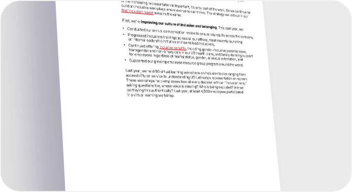 37 Social We still have more work to do to increase representation of historically marginalized groups. We’re expanding inclusive hiring training for recruiters and managers, creating access for emerging talent by adding three Hispanic Serving Institutions (HSIs) and more HBCUs (totaling four) to our pipeline programs , and finding new ways to diversify our executive and company networks. While increasing representation is important, it’s only part of the work. So we continue to build an inclusive workplace where everyone can thrive. The strategy we laid out in our first inclusion report remains the same. First, we’re improving our culture of inclusion and belonging . This past year, we: • Conducted our annual compensation review to ensure pay equity across the company, • Progressed inclusions trainings across all our offices, most recently launching an internal leadership initiative on how to lead inclusively, • Continued offering inclusive benefits , including gender-inclusive parental leave, transgender and non-binary care in our US health plans, and family-forming support for employees regardless of marital status, gender, or sexual orientation, and • Supported our growing employee resource group program around the world. Last year, we held 90 virtual learning workshops on inclusion topics ranging from accessibility on service to understanding US Latino/a/x representation on-screen. These workshops help employees look at every decision with an “inclusion lens,” asking questions like, whose voice is missing? Who is being excluded? Are we portraying this authentically? Last year, at least 4,500 employees participated in a virtual learning workshop.