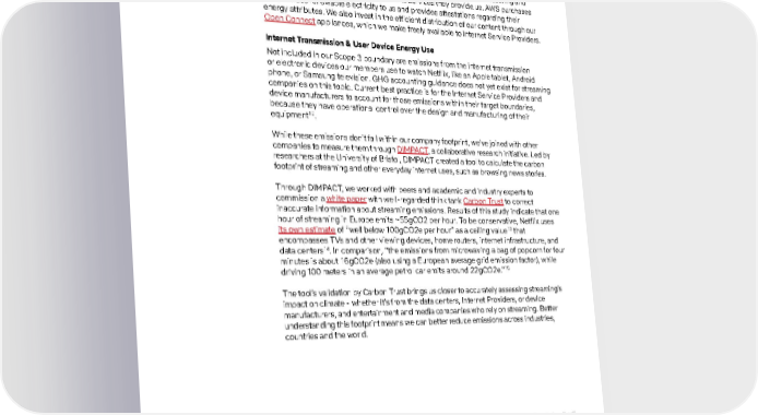 Environmental 11 Data Centers We work with Amazon Web Services (AWS) for our data storage needs. AWS has set a goal of being 100% renewable by 2025 and we work with them on measuring and reporting the emissions associated with the services they provide us. AWS purchases and provides renewable electricity to us and provides attestations regarding their energy attributes. We also invest in the efficient distribution of our content through our Open Connect appliances, which we make freely available to Internet Service Providers. Internet Transmission & User Device Energy Use Not included in our Scope 3 boundary are emissions from the internet transmission or electronic devices our members use to watch Netflix, like an Apple tablet, Android phone, or Samsung television. GHG accounting guidance does not yet exist for streaming companies on this topic. Current best practice is for the Internet Service Providers and device manufacturers to account for those emissions within their target boundaries, because they have operational control over the design and manufacturing of their equipment 12 . While these emissions don’t fall within our company footprint, we’ve joined with other companies to measure them through DIMPACT , a collaborative research initiative. Led by researchers at the University of Bristol, DIMPACT created a tool to calculate the carbon footprint of streaming and other everyday internet uses, such as browsing news stories. Through DIMPACT, we worked with peers and academic and industry experts to commission a white paper with well-regarded think tank Carbon Trust to correct inaccurate information about streaming emissions. Results of this study indicate that one hour of streaming in Europe emits ~55gCO2 per hour. To be conservative, Netflix uses its own estimate of “well below 100gCO2e per hour” as a ceiling value 13 that encompasses TVs and other viewing devices, home routers, internet infrastructure, and data centers 14 . In comparison, “the emissions from microwaving a bag of popcorn for four minutes is about 16gCO2e (also using a European average grid emission factor), while driving 100 meters in an average petrol car emits around 22gCO2e.” 15 The tool’s validation by Carbon Trust brings us closer to accurately assessing streaming’s impact on climate - whether it’s from the data centers, Internet Providers, or device manufacturers, and entertainment and media companies who rely on streaming. Better understanding this footprint means we can better reduce emissions across industries, countries and the world. 12 Per the GHG Protocol, the most common method by which to allocate emissions to one company or another is called “operational control method” (page 18 of the Protocol). 13 Another highly regarded report from the IEA cites a 36gCO2 per hour figure, which is less than the Carbon Trust white paper and significantly less than Netflix’s conservative estimate. 14 Location and device choices also determine the hourly footprint itself within the <100gCO2e/hour range. The sources of the household’s and infrastructure’s electricity are the main variables. To be conservative, our calculations do not take account for regions where hourly emissions are lower due to partial or full renewable energy usage from the grid. 15 Carbon Trust whitepaper, page 8.