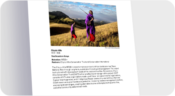 23 Environmental Chyulu Hills VCS 1408 Southeastern Kenya Retention: REDD+ Partners: Chyulu Hills Conservation Trust and Conservation International The Chyulu Hills REDD+ project enhances an iconic African landscape near Tsavo National Park through long-term, sustainable financing and management. The project is structured with development needs of the local communities. For example, Chyulu Hills Conservation Trust (CHCT) is the beneficent and manager of the project. CHCT consists of 9 Trustee organizations made up of 3 local non-governmental organizations, 2 government agencies, and 4 indigenous Maasai communally-owned Group Ranches. Credit revenues support landscape protection, improving livestock management practices, employing forest rangers, creating alternative income and employment opportunities, and other community-determined needs. Photo credit: ©Charlie Shoemaker