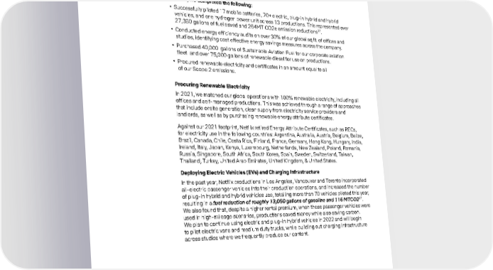 14 Environmental Delivering on our Science-Based Target: 2021 Progress In 2021, based on our key sources of emissions, we put together a plan and decarbonization roadmap to reduce emissions that put us on a path to delivering on our science-based target by 2030. In 2021, we completed the following: • Successfully piloted 17 mobile batteries, 70+ electric, plug-in hybrid and hybrid vehicles, and one hydrogen power unit across 13 productions. This represented over 27,380 gallons of fuel saved and 264MT CO2e emission reductions 17 . • Conducted energy efficiency audits on over 30% of our global sq ft. of offices and studios, identifying cost effective energy savings measures across the company. • Purchased 40,000 gallons of Sustainable Aviation Fuel for our corporate aviation fleet and over 75,000 gallons of renewable diesel for use on productions. • Procured renewable electricity and certificates in an amount equal to all of our Scope 2 emissions. Procuring Renewable Electricity In 2021, we matched our global operations with 100% renewable electricity, including all offices and self-managed productions. This was achieved through a range of approaches that include onsite generation, clean supply from electricity service providers and landlords, as well as by purchasing renewable energy attribute certificates. Against our 2021 footprint, Netflix retired Energy Attribute Certificates, such as RECs, for electricity use in the following countries: Argentina, Australia, Austria, Belgium, Belize, Brazil, Canada, Chile, Costa Rica, Finland, France, Germany, Hong Kong, Hungary, India, Ireland, Italy, Japan, Kenya, Luxembourg, Netherlands, New Zealand, Poland, Romania, Russia, Singapore, South Africa, South Korea, Spain, Sweden, Switzerland, Taiwan, Thailand, Turkey, United Arab Emirates, United Kingdom, & United States. Deploying Electric Vehicles (EVs) and Charging Infrastructure In the past year, Netflix productions in Los Angeles, Vancouver and Toronto incorporated all-electric passenger vehicles into their production operations, and increased the number of plug-in hybrid and hybrid vehicles use, totalling more than 70 vehicles piloted this year, resulting in a fuel reduction of roughly 13,050 gallons of gasoline and 116 MTCO2 17 . We also found that, despite a higher rental premium, when these passenger vehicles were used in high-mileage scenarios, productions saved money while also saving carbon. We plan to continue using electric and plug-in hybrid vehicles in 2022 and will begin to pilot electric vans and medium duty trucks, while building out charging infrastructure across studios where we frequently produce our content. 17 Includes reductions from productions ending in 2021, and accrued reductions from productions wrapped in 2022.