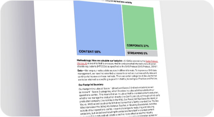 10 Environmental 10 All emission factors are applied to the data and updated annually to reflect the latest guidance and factors published by EPA eGRID2019 (EPA, 2021) and The Climate Registry (TCR, 2021). In some cases, where data may not be available or of sufficient quality, Netflix will use proxy data, industry-average figures or rely on experts. In such instances, we use third-parties for reliability and completeness. 11 The boundary was established in alignment with the GHG Protocol Corporate and Scope 3 Standards. Footprint Components —Netflix is an entertainment company. Over half of our footprint lies within the physical production of our Netflix-branded content (“content”), followed by our corporate operations and purchased goods (“corporate”), followed by our data center providers (“streaming”). Netflix’s 2021 company carbon footprint by business activity Methodology: How we calculate our footprint —All GHGs covered by the Kyoto Protocol (Annex A) relevant to Netflix are accounted for and converted into metric tons of carbon dioxide equivalents (MTCO2e) as specified by the GHG Protocol (GHG Protocol, 2004) 10 . Data —We keep our various data sources in different formats. To improve our GHG data management, we have implemented a process to collect any business activity data and continue to improve on these methods. There are certain categories of documents that are to be retained by specific groups within Netflix, following our Practices and Policies. Our Footprint Boundary Our footprint includes all Scope 1 (direct) and Scope 2 (indirect emissions) as well as relevant 11 Scope 3 categories, which therefore includes activities outside of our operational control. This means that we include all Netflix-branded content production, whether we manage the production directly (like Don’t Look Up ), or through a third-party production company (like Holiday in the Wild, Our Planet, Bill Nye Saves the World , or You vs. Wild ) as well as all content that we license that is Netflix-branded (like The Boy Who Harnessed the Wind, My Octopus Teacher , or Breaking Boundaries ). Activities outside of our operational control present challenges to measuring and reducing emissions, but we believe including the emissions from Netflix-branded content (wherever it is produced) will create a positive ripple effect across the industry. Engaging these groups requires a significant investment in collaboration across our value chain that can be resource-intensive, but we think this ultimately strengthens Netflix’s business network. STREAMING 5% CORPORATE 37% CONTENT 58%