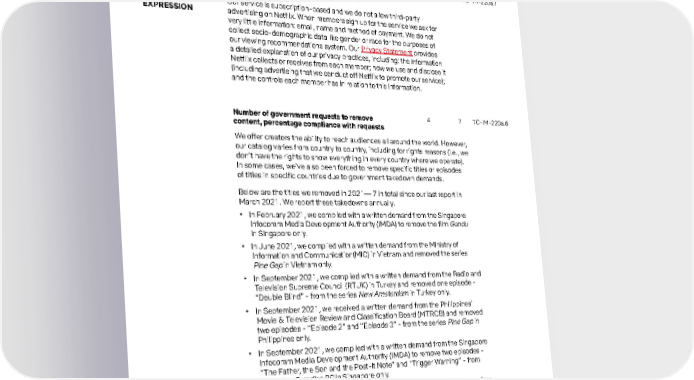 39 Social Our service is subscription-based and we do not allow third-party advertising on Netflix. When members sign up for the service we ask for very little information: email, name and method of payment. We do not collect socio-demographic data like gender or race for the purposes of our viewing recommendations system. Our Privacy Statement provides a detailed explanation of our privacy practices, including: the information Netflix collects or receives from each member; how we use and disclose it (including advertising that we conduct off Netflix to promote our service); and the controls each member has in relation to this information. TOPICS DATA PRIVACY, ADVERTISING STANDARDS & FREEDOM OF EXPRESSION ACCOUNTING METRICS - INTERNET MEDIA & SERVICES 2020 2 021 SASB CODE TC-IM-220a.1 Description of policies and practices relating to behavioral advertising and user privacy We offer creators the ability to reach audiences all around the world. However, our catalog varies from country to country, including for rights reasons (i.e., we don’t have the rights to show everything in every country where we operate). In some cases, we’ve also been forced to remove specific titles or episodes of titles in specific countries due to government takedown demands. Below are the titles we removed in 2021— 7 in total since our last report in March 2021. We report these takedowns annually. • In February 2021, we complied with a written demand from the Singapore Infocomm Media Development Authority (IMDA) to remove the film Gandu in Singapore only. • In June 2021, we complied with a written demand from the Ministry of Information and Communication (MIC) in Vietnam and removed the series Pine Gap in Vietnam only. • In September 2021, we complied with a written demand from the Radio and Television Supreme Council (RTUK) in Turkey and removed one episode - “Double Blind” - from the series New Amsterdam in Turkey only. • In September 2021, we received a written demand from the Philippines’ Movie & Television Review and Classification Board (MTRCB) and removed two episodes - “Episode 2” and “Episode 3” - from the series Pine Gap in Philippines only. • In September 2021, we complied with a written demand from the Singapore Infocomm Media Development Authority (IMDA) to remove two episodes - “The Father, the Son and the Post-It Note” and “Trigger Warning” - from the series Paradise PD in Singapore only. • In November 2021, we complied with a written demand from Roskomnadzor in Russia to remove the series Tokyo Ghoul in Russia only. • In December 2021, we complied with a written demand from the Radio and Television Supreme Council (RTUK) in Turkey to remove the film Donde caben dos in Turkey only. TC-IM-220a.6 4 7 Number of government requests to remove content, percentage compliance with requests