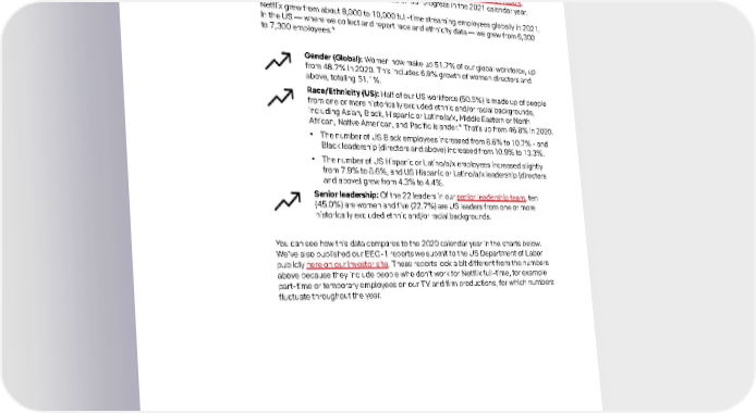 33 Social Gender (Global): Women now make up 51.7% of our global workforce, up from 48.7% in 2020. This includes 6.9% growth of women directors and above, totaling 51.1%. Race/Ethnicity (US): Half of our US workforce (50.5%) is made up of people from one or more historically excluded ethnic and/or racial backgrounds, including Asian, Black, Hispanic or Latino/a/x, Middle Eastern or North African, Native American, and Pacific Islander.* That’s up from 46.8% in 2020. • The number of US Black employees increased from 8.6% to 10.7% - and Black leadership (directors and above) increased from 10.9% to 13.3%. • The number of US Hispanic or Latino/a/x employees increased slightly from 7.9% to 8.6%, and US Hispanic or Latino/a/x leadership (directors and above) grew from 4.3% to 4.4%. Senior leadership: Of the 22 leaders in our senior leadership team , ten (45.0%) are women and five (22.7%) are US leaders from one or more historically excluded ethnic and/or racial backgrounds. You can see how this data compares to the 2020 calendar year in the charts below. We’ve also published our EEO-1 reports we submit to the US Department of Labor publicly here on our investor site . These reports look a bit different from the numbers above because they include people who don’t work for Netflix full-time, for example part-time or temporary employees on our TV and film productions, for which numbers fluctuate throughout the year. Inclusion Inside Netflix: Progress Since Our First Report Our members come from many different countries and cultures and to entertain them we need a workplace that’s equally diverse. Last January, we dove deep into everything we’re doing on inclusion in the company by publishing Netflix’s first inclusion report . We published an update in February 2022 on our progress in the 2021 calendar year. Netflix grew from about 8,000 to 10,000 full-time streaming employees globally in 2021. In the US — where we collect and report race and ethnicity data — we grew from 6,300 to 7,300 employees.*