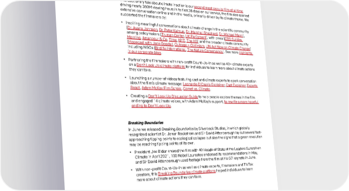 27 Don’t Look Up This cautionary tale about climate inaction is our second most popular film of all time driving nearly 360M viewing hours in its first 28 days on our service, the film also sparked extensive conversation online and in the media, primarily driven by its climate theme. We supported the filmmakers by: • Inspiring meaningful conversations about climate change in the scientific community [ Dr. Ayana Johnson , Dr. Peter Kalmus , Dr. Marshall Shepherd , Dr. Michael Mann ], among policymakers [ Truman Center , UK Parliament ], with press [ CBS Sunday Morning , Amanpour & Co , Time , NYT , The Hill ] and the broader climate community [ Hopecast with Jane Goodall , Outrage + Optimism , UN Act Now on Climate Change ] including NGOs [ Birdlife International , The Nature Conservancy ]. See more highlights in our corporate blog . • Partnering the filmmakers with non-profit Count-Us-In as well as 40+ climate experts on a Don’t Look Up climate platform for individuals to learn more about climate actions they can take. • Launching a number of videos featuring cast and climate experts to spark conversation about the film’s climate message: Leonardo DiCaprio Explainer , Cast Explainer , Experts React , Adam McKay Film School , Comet vs. Climate . • Creating a Don’t Look Up Discussion Guide to help people explore themes in the film and engaged 14 climate voices, with Adam McKay’s support, to rewrite a more hopeful ending to Don’t Look Up . Breaking Boundaries In June we released Breaking Boundaries by Silverback Studios, in which globally recognized scientist Dr. Johan Rockstrom and Sir David Attenborough lay out several fast- approaching tipping points to ecological collapse but also the signs that a green revolution may be reaching tipping points of its own. • President Joe Biden shared the film with 40 Heads of State at the Leaders Summit on Climate in April 2021, 100 Nobel Laureates endorsed its recommendations in May, and Sir David Attenborough used footage from the film at his G7 keynote in June. • With non-profit Count-Us-In as well as climate experts, filmmakers and TikTok creators, this Breaking Boundaries climate platform helped individuals to learn more about climate actions they can take. Environmental Many of our filmmakers seek to entertain and enrich their viewers’ experience with educational, conversation-sparking and community-building resources. Working with select filmmakers and non-profit partners, we supported two pilots in 2021: