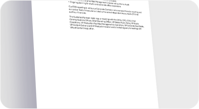 Environmental 7 Embedding Sustainability As with all organizational changes, they are most effective when incorporated into existing practices and governance structures. To that end, sustainability is now a standard part of: • Our quarterly briefing memos for the Board of Directors • Our standard Enterprise Risk Management process led by Internal Audit • Ongoing planning for studio and corporate office expansions Our ESG reporting is led by our Corporate Controller who oversees financial reporting and our carbon footprint assurance is led by the same Independent Accountants (EY) that audit our financials. The Sustainability team hosts regular meetings with the CEOs, CFO, COO, Chief Communications Officer, Chief Marketing Officer, VP Global Public Policy, VP Studio Operations, VP Production Facilities Management & Operations, VP Corporate Real Estate, VP Content Delivery and VP Product Innovation and is invited regularly to meetings with VPs of Content Acquisition.