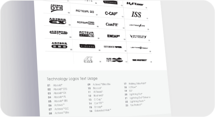 01 Abzorb ® 02 Abzorb ® DTS 03 Abzorb ® EX 04 Abzorb ® FL 05 Abzorb ® SBS 06 Acteva™ 07 Acteva™GC 08 Acteva™Lite 09 Acteva™Ultra Lite 10 Biocool ® 11 AT Tread ® 12 Bioshield ® 13 C-Cap ® 14 ComFit™ 15 Encap ® 16 Extended Web™ 17 Walking Strike Path ® 18 H2Flow™ 19 ISS ® 20 Lightning Dry ® 21 Lightning Dry ® Extreme 22 Lightning Fresh™ 23 Toe Protect™ Technology Logos Text Usage page 36 logo / technology logos 01 06 12 02 07 13 03 08 14 04 09 15 05 10 16 18 19 20 21 22 11 17 23 N is for fit™ For love or money™ Studioflex™ Tagline Text Usage