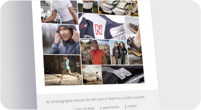 page 14 achieve A. Portraits at the moment of achievement, rest, elation B. Achieving Personal Best C.Emotion in action – In the Moment take me there A. I want to be running, walking, [insert your activity here] there. performance A. Full body in motion B. Highlight footwear in motion on body C. Highlight apparel in motion on body product A. Catalog B. Co-op C. Beauty a. Detail b. In the environment (non-performance) c. In the studio All photography should fall into one of these four stylistic buckets: photography / what to look for