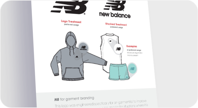 This logo was engineered specifically for on garment id to improve quality of reproduction at small sizes and/or for situations where it is difficult to recreate the "existing nb" logo with integrity due to it's size. Including but not limited to: > Reflective Heat Transfers > Flock Logos > Embroidered Logos > Applique's NB for garment branding logo / applied to stitching Logo Treatment preferred usage Stacked Treatment preferred usage Examples of preferred usage Make sure registration mark is present page 29