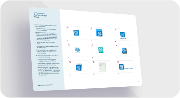 2. Visual toolkit New York Life logo: Misuse At times, what we shouldn’t do is as important as what we should do . 1 . The color of the New York Life wordmark should not be altered . 2 . Except in rare instances, the New York Life primary logo should never appear on a colored background . The only exception is within our campaign, certain sponsorship activations, and specific promotional items 1. 2. 3. when deemed appropriate . 3 . Never rearrange the logo and tagline lockup . 4 . The wordmark should never appear without its holding shape . 5 . The logo should never appear in a color other than New York Life Blue, or black when necessary . 6 . Never add a drop shadow or other effects to the New York Life logo . 4. 5. 6. 7 . The logo should no longer be used or manipulated to appear as a gift box . 8 . Always be sure to maintain the proper clear Lorem ipsum space around the New York Life logo . dolor sit amet. Consectetur adipiscing elit, etiam non lorem nibh. Maecenas vitae tellus. 9 . We redirected from “The Company You Keep” to: “Be Good at Life .” As part of this redirect, it’s best to replace “The Company You Keep” with the stand-alone New York Life logo or the New York Life/Be Good at Life logo lockup . 7. 8. 9. New York Life brand guidelines 11