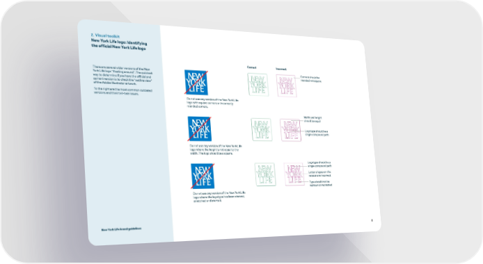 2. Visual toolkit New York Life logo: Identifying the official New York Life logo Correct Incorrect There are several older versions of the New Corners should be York Life logo “floating around” . The quickest rounded not square way to determine if you have the official and current version is to check the “outline view” of the Adobe Illustrator artwork . To the right are the most common outdated versions and their tell-tale issues . Do not use any version of the New York Life logo with square corners or incorrectly rounded corners. Width and height should be equal Logotype should be a single compound path Do not use any version of the New York Life logo where the height is not equal to the width. The logo should be a square. Logotype should be a single compound path Letter shapes on this version are incorrect Type should not be redrawn or recreated Do not use any version of the New York Life logo where the logotype has been skewed, stretched or distorted. New York Life brand guidelines 8