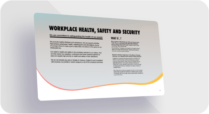 WORKPLACE HEALTH, SAFETY AND SECURITY We are committed to safeguarding the health of our people We promote healthy lifestyles and workplaces. And we support activities that enhance employees’ health, wellbeing and work-life balance. As we encourage others to make sport a daily habit, we believe in the same for our employees too. Our belief in health and safety in the workplace extends to our visitors. And we fully expect our suppliers, contractors and other business partners to place an equally high priority on health and safety in their operations. We do not tolerate any acts or threats of violence. Subject to and consistent with local law, we prohibit or restrict weapons on all of the company’s premises. My ex-partner is threatening my safety, and knows where I work. My ex is still friends with other Nike employees, and I’m nervous about what might happen to me if I say something. What should I do? Say something. This person is a threat to your safety and the safety of the other Nike employees. Reporting this security issue lets us better protect everyone. WHAT IF...? My team is having a happy hour in the office on Thursday afternoon. Am I allowed to drink alcohol on Nike premises? It depends. In general, Nike allows alcohol in its offices, but offices in some countries, stores and distribution centers may have other policies. Check with your manager and any applicable policies. In any event, drinking to the point of impairment is never tolerated. Never drink in a way that leads to inappropriate behavior, endangers the safety of others or violates the law. Also, take care to make sure people who don’t or can’t consume alcohol feel included and welcome in whatever event you plan on hosting. We’re at our best when everyone feels included and a part of the team. 15