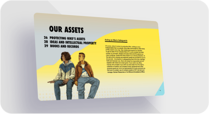 OUR ASSETS PROTECTING NIKE’S ASSETS IDEAS AND INTELLECTUAL PROPERTY BOOKS AND RECORDS 26 28 29 Acting as Nike’s Safeguards Of course, when it comes to protecting Nike, nothing is more indispensable than our people. We’re also surrounded by other kinds of Nike assets every day. Take intellectual property for example. To get an idea of how valuable Nike’s IP is, just consider the sheer number of concepts, designs and plans that exist throughout our many buildings. Assets like these deserve our utmost protection. At the same time, physical and electronic assets are provided for you to do your job – be proactive in safeguarding them from loss, damage, theft and improper use. Above all, please be responsible and not wasteful with what we’ve been given. If you work in an office, nobody will complain if you drink an extra water from the team’s collection of snacks, but company funds, equipment and other physical assets are not to be appropriated for purely personal use. Not sure if a certain use of company assets is OK? Just ask your manager, Human Resources or the Ethics & Compliance Office . 25